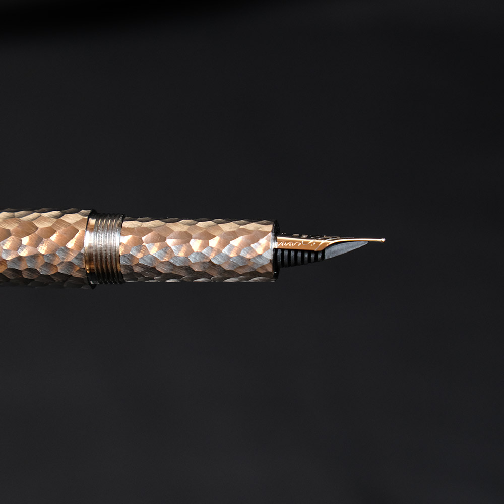 本モデルは、職人が一本一本丁寧に打ち出した鎚目(ハンマー)仕上げが特徴。